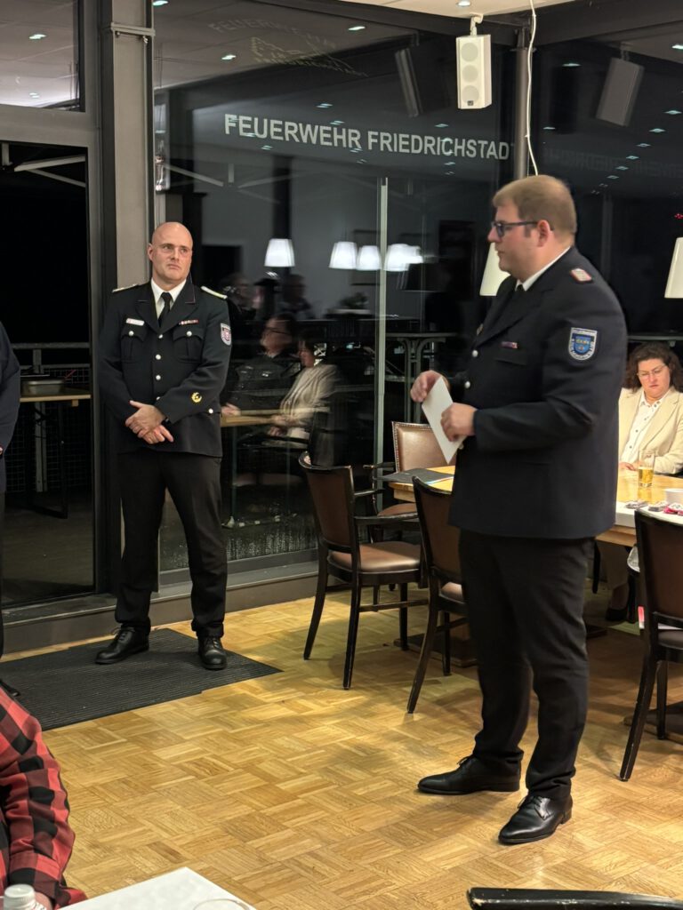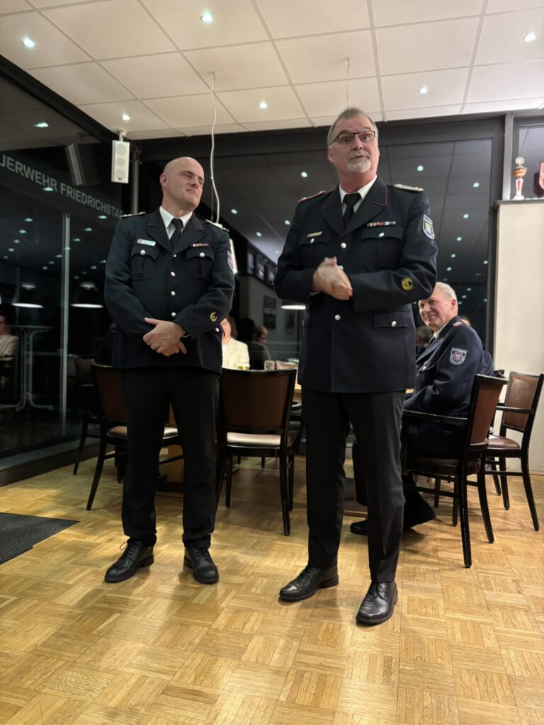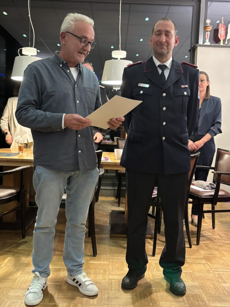 Ein Höhepunkt des Abends war die Verleihung des Brandschutzehrenzeichens in Silber an Ronny Köth durch den stellvertretenden Bürgermeister Uwe Eisenmann. Dieser bedankte sich nicht nur bei Ronny Köth für sein großes Engagement, sondern auch bei allen Kameradinnen und Kameraden im Namen der Stadtverordneten: „Ihr seid eine großartige Truppe, und ich freue mich sehr, diesen Abend mit euch gemeinsam ausklingen zu lassen.“