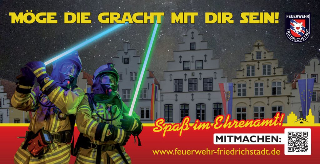Friedrichstadt, 30. November 2025 – Mit einer ungewöhnlichen Mischung aus Star Wars, Gemeinschaftsgeist und Feuerwehreinsätzen hat die Freiwillige Feuerwehr Friedrichstadt auf der Grachtenweihnacht 2025 erfolgreich für das Ehrenamt „Feuerwehr“ geworben. Unter dem Motto „Möge die Gracht mit dir sein“ präsentierte die Feuerwehr eine Kampagne, die nicht nur Verantwortung, sondern auch Spaß, Teamarbeit und spannende Erlebnisse in den Vordergrund stellt.